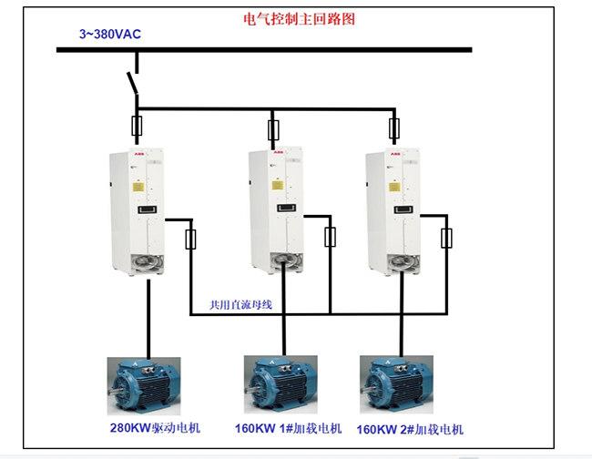 一臺變頻器(驅動變頻器)控制驅動電機運行轉動,通過聯軸器(減速機)帶動加載電機轉動。通過另二臺變頻器(加載變頻器)的控制,使加載電機處于力矩加載發電狀態,其發出的電能經加載ABB變頻器的IGBT整流單元,輸出直流電,直接與驅動變頻器的直流母線連接,經逆變后轉換成三相交流電供給驅動電機。使整個系統的電能形成一個內部交流循環,從而達到節能目的。